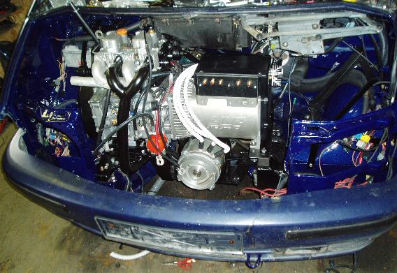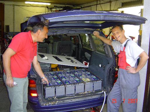 At first there was only an idea to make an electric car being better then what big companies show us. The first work started in september 2007 by taking the ICE engine out and refurnishing the engine compartment of the car. After half a year of collecting the necessary parts we started by assembling it together. 25th of July 2007 was the day when the electric motor turned for the first time. Beginning of August we made first test drives and at the end of August we drove it first time in heavy traffic of Ljubljana. Beginning of November 2007 we did the first log drive (60 km) and since then we have used it daily. After installing new LiPo batteries in May 2008 its pure electric range raised to 200 km and it became really usefull. Last modifications (double heating) have been done in January 2009. During the last year of use (10000 km) it had only one brakdown.