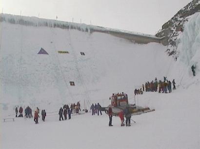 Nedaleč stran so ob robu ledenika Eisenboden slapovi - normalno kakih 20, tokrat pa je jih je bilo narejenih le nekaj, pa še ti so imeli v zgornjem delu kakšen detajl bolj po skali. Izbrala sva slap Sweety (Wi6), ki je bil vsaj spodaj osončen, da sva si ogrela premrzle prste. |